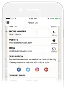 Provide contact details, directions, social links and your opening hours from one easy to access tab.